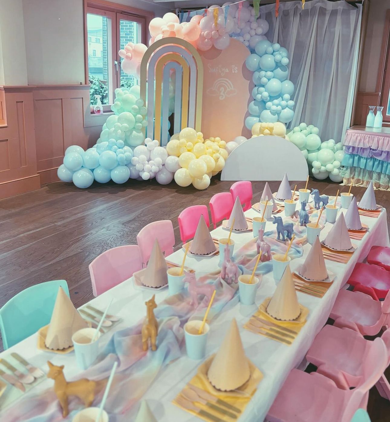 Sufiya is 3! The cutest pastel rainbow colours was the theme for this very special third birthday party at Jaego's House, Kensal Rise, London. The event decoration for the day included a balloon display featuring our rainbow sailboard and dressed children's table which included plates, cutlery, cups, straws, party hats, table runner and cute ornamental unicorns!